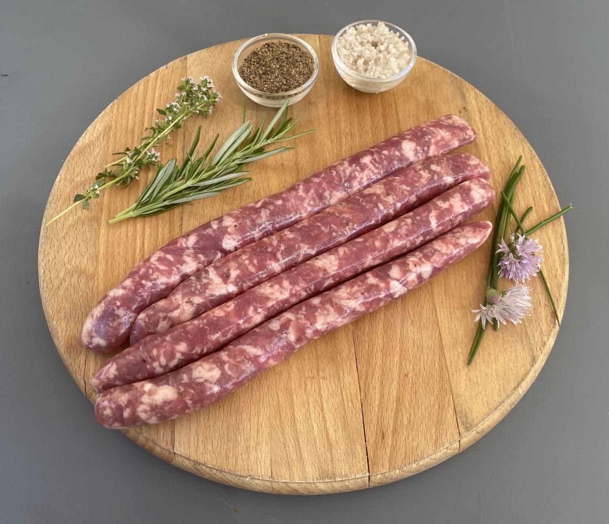 Maigre et épaule de porc noir gascon, sel, poivre, boyaux naturels