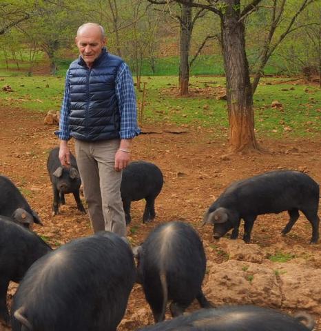 Porcs noirs élevés en plein air intégral (chênes des causses du Quercy) pendant 16 mois minimum. Alimentation à base de céréales nobles, sans OGM.