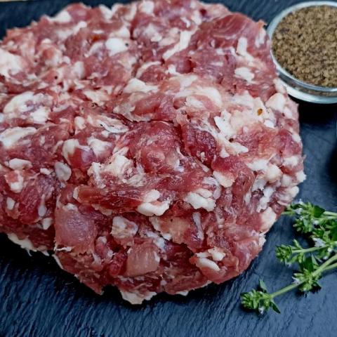 Maigre et gras de Porc Noir Gascon, sucre, vin rouge, ail moulu, sel poivre. Sans sel nitrité ni produits de synthése