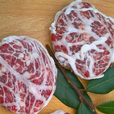 Epaule et poitrine de porc noir gascon, sel, épices Bio, sans sel nitrité ni produits de synthése