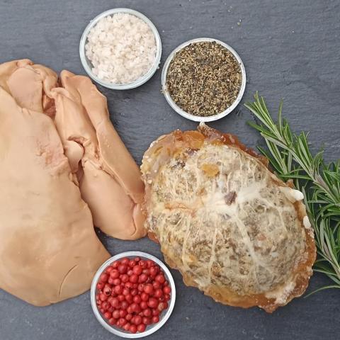Maigre et poitrine de porc noir gascon, foie gras (25%) , oeufs, porto, sel, poivre Idéal pour farcir les chapons et volailles.