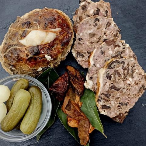 Gorge et épaule de porc noir gascon, foie de porc, oeufs, oignons, crépine, sel, poivre