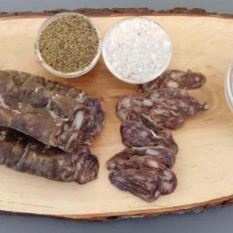 Maigre et épaule de porc noir gascon, sel, poivre, boyaux naturels