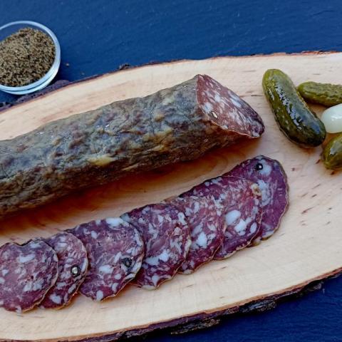 Saucisse sèche de Porc noir Gascon. Assaisonnement à base de sel et poivre de Madagascar. Aucun produits de conservation ni sel nitrité !!!